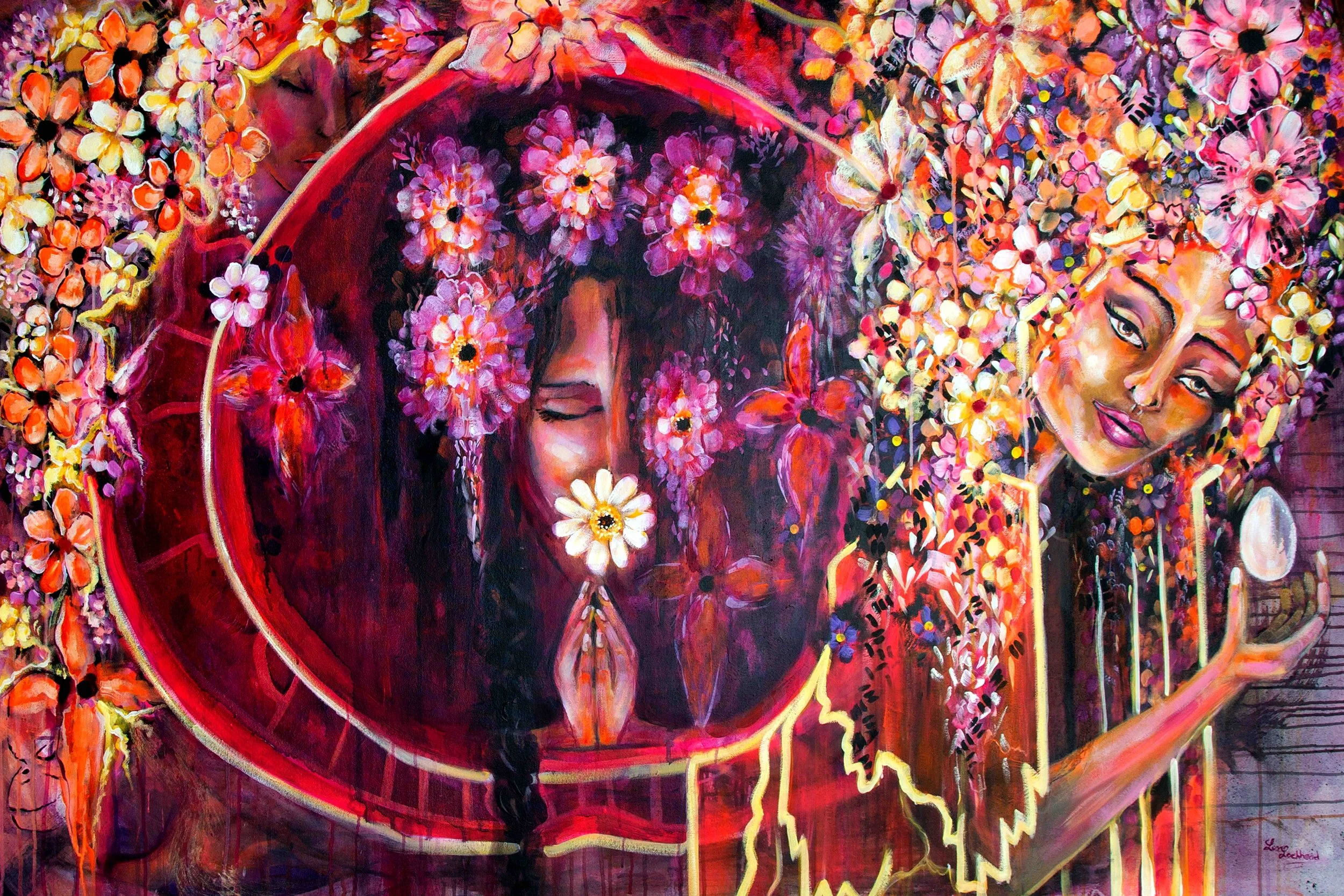 She is 1.5m x 1m on deep edge canvas so there is no need to frame the painting. Created in acrylics and finished in oils she is special painting that speaks of holding the space for the rights and safety of women, for our girls, to create a future of ripe potential and beauty in our world.