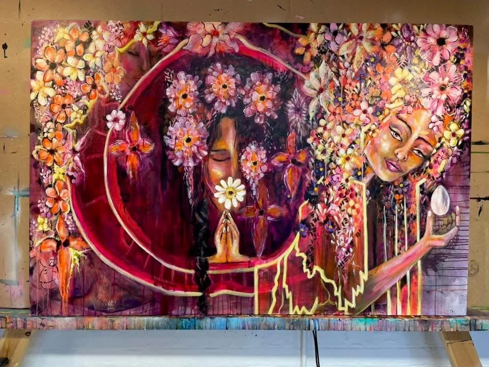 This artwork was painted just before I ran an Art Project called 'I Am Woman'. Which was about woman finding her voice through the creative process. And she is a powerful painting about woman's voice and her rights to safety. Last year I kept feeling she was to be raffled to raise funds but didn't know who for - it hadn't quite dropped in. As the women in the rape gang inquiry find their voice and a platform to be heard I cannot imagine a more aligned painting to offer to help raise funds for this important work. So all funds raised will be donated to this inquiry.